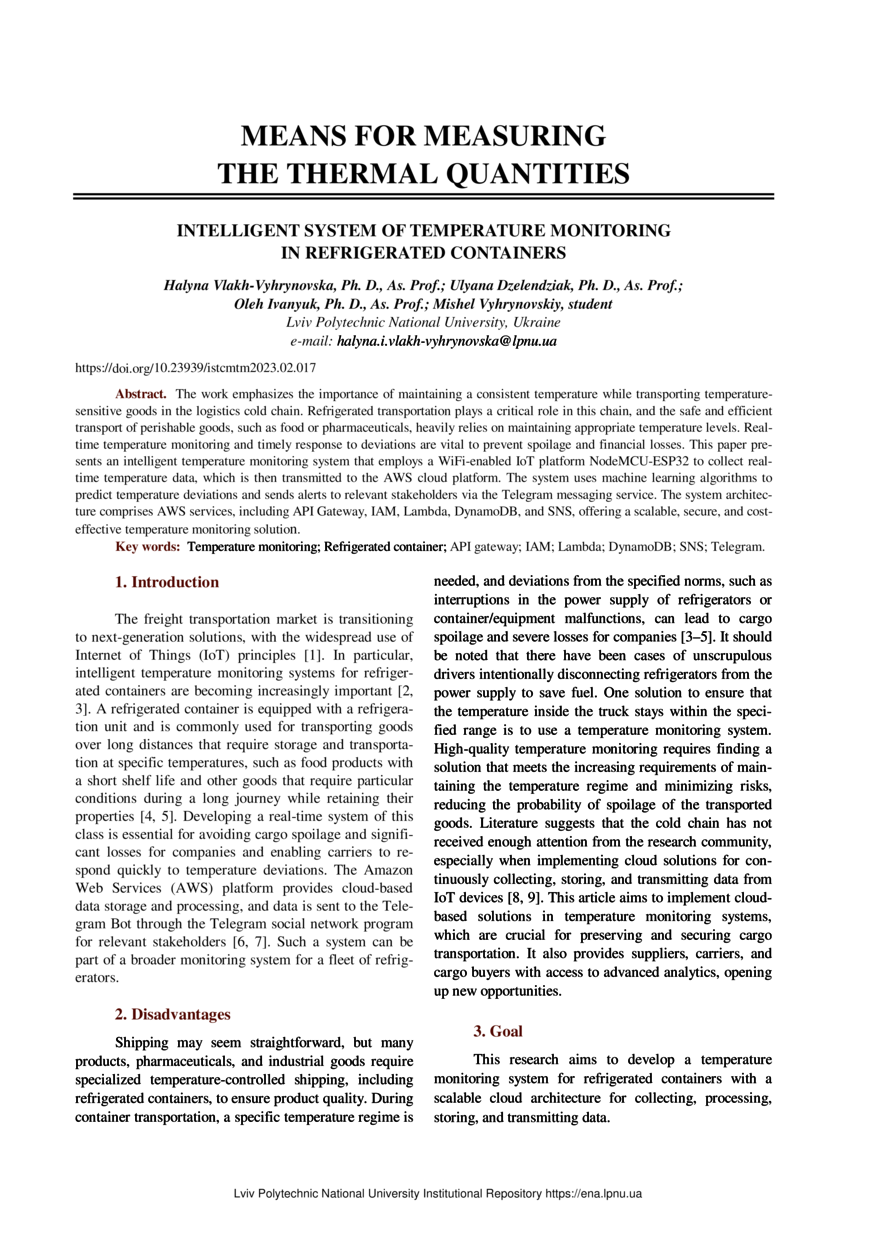 Intelligent system of temperature monitoring in refrigerated containers / Halyna Vlakh-Vyhrynovska, Ulyana Dzelendziak, Oleh Ivanyuk, Mishel Vyhrynovskiy // Measuring Equipment and Metrology. — Lviv : Lviv Politechnic Publishing House, 2023. — Vol 84. — No 2. — P. 17–22.