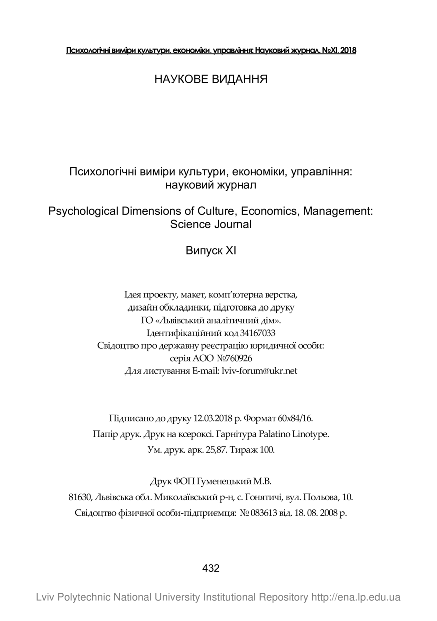 Видавнича сторінка // Психологічні виміри культури, економіки, управління : науковий журнал. — Львів, 2018. — Том 11. — С. 432.