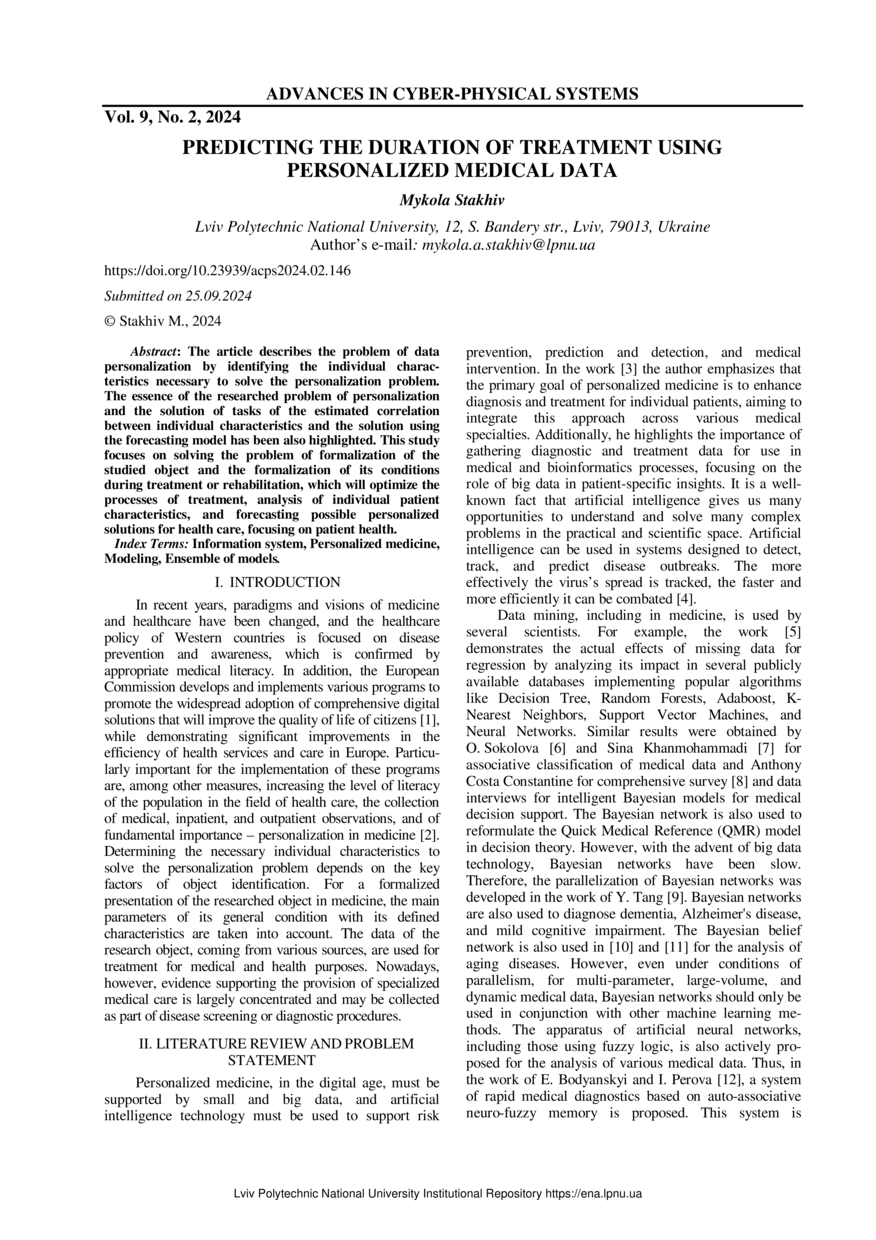 Stakhiv M. Predicting the Duration of Treatment Using Personalized Medical Data / Mykola Stakhiv // Advances in Cyber-Physical Systems. — Lviv : Lviv Politechnic Publishing House, 2024. — Vol 9. — No 2. — P. 146–150.
