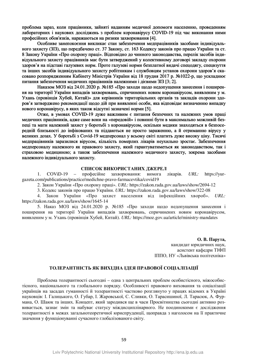 Парута О. В. Толерантність як вихідна ідея правової соціалізації / О. В. Парута // Захист прав і свобод людини та громадянина в умовах формування правової держави : збірник тез ІХ Всеукраїнської науково-практичної конференції, 30 травня 2020 року, Львів. — Львів : Видавництво Львівської політехніки, 2020. — С. 59–61. — (Філософсько-правові, теоретико-правові аспекти захисту прав і савобод людини та громадянина в умовах формування правової держави).