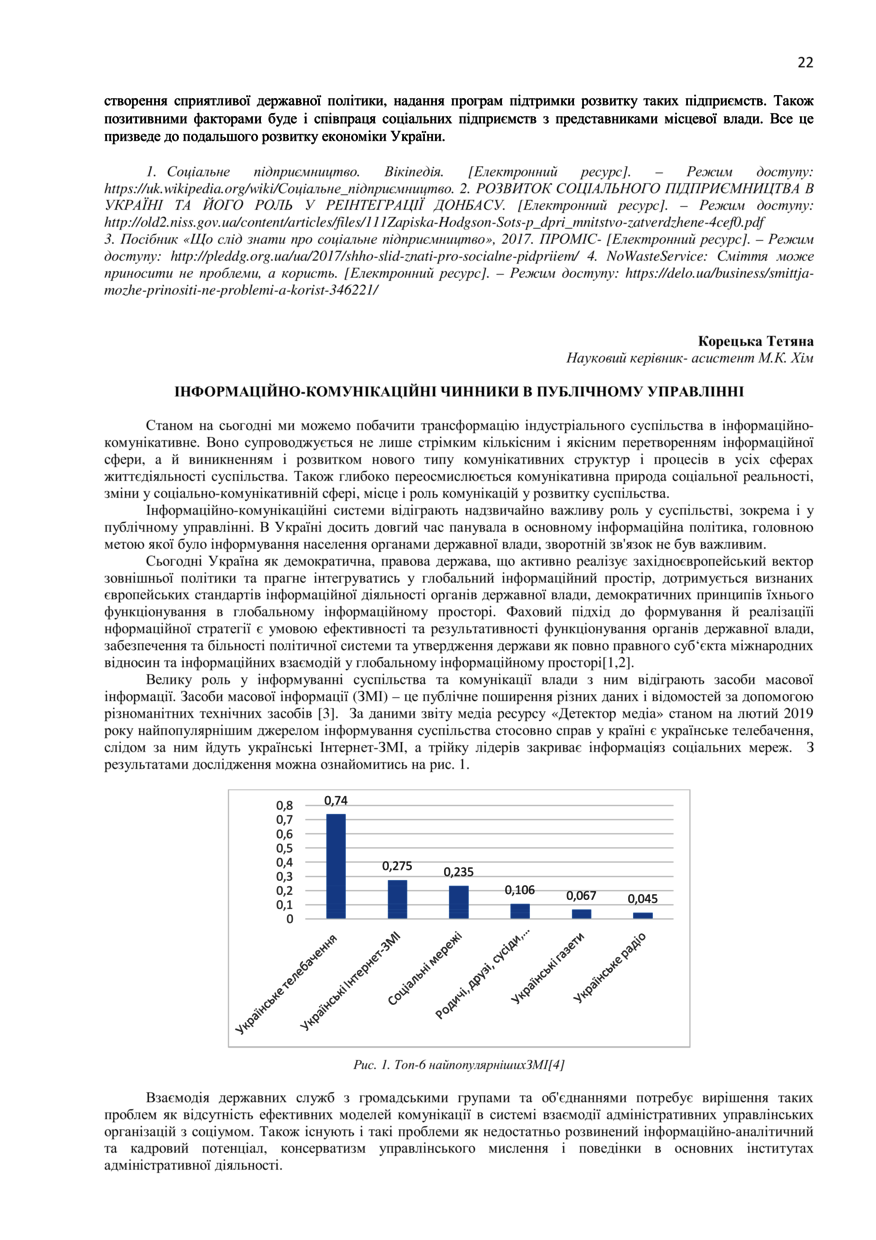 Корецька Т. Інформаційно-комунікаційні чинники в публічному управлінні / Тетяна Корецька, М. К. Хім // 77-ма Студентська науково-технічна конференція. Секція "Публічне управління та адміністрування" : збірник тез доповідей, 7 листопада 2019 року, Львів. — Львів : Видавництво Львівської політехніки, 2019. — С. 22–23. — (Адміністративний менеджмент).
