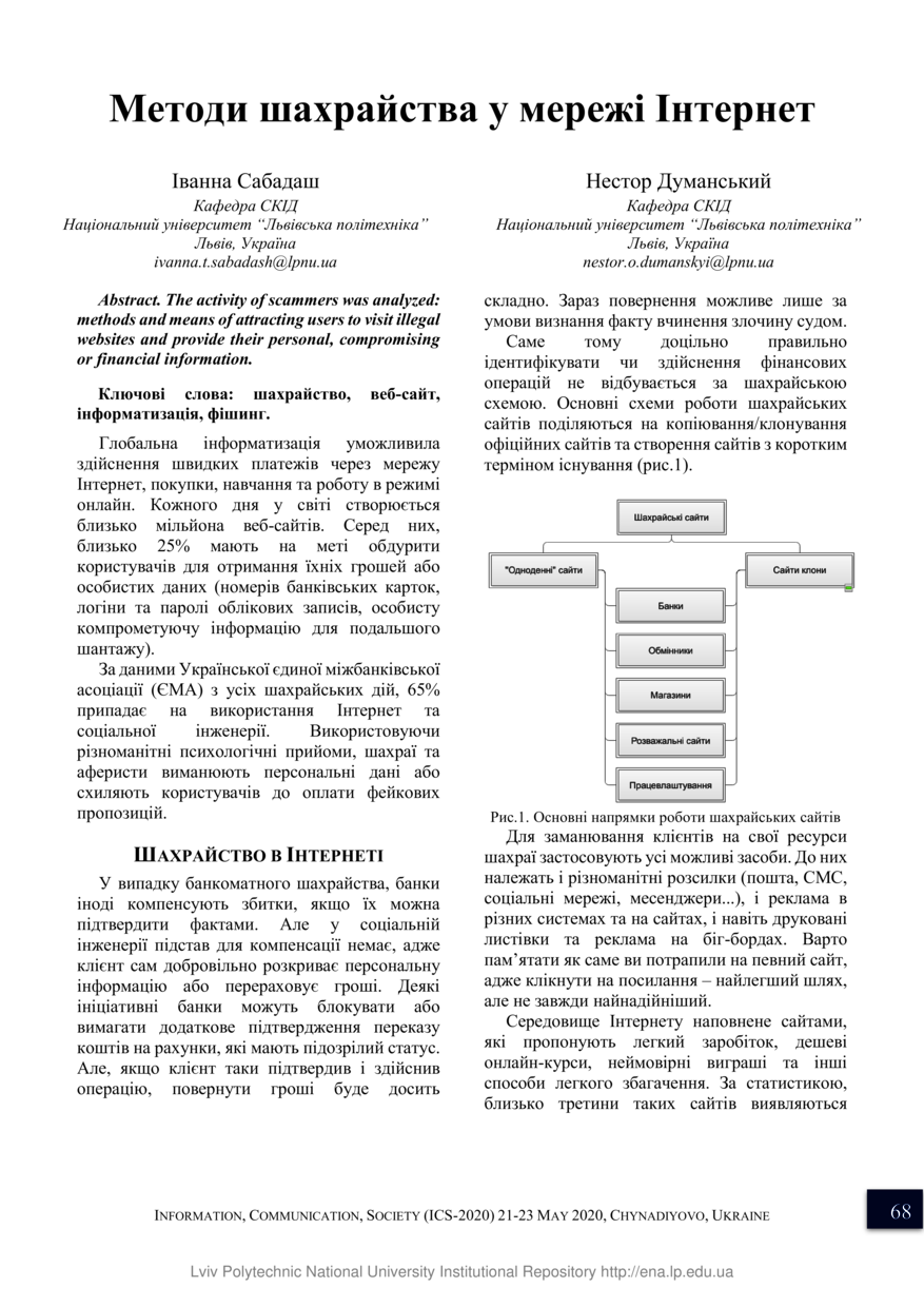 | dc.identifier.citationen | Sabadash I. Metody shakhraistva u merezhi Internet / Ivanna Sabadash, Nestor Dumanskyi // Informatsiia, komunikatsiia, suspilstvo 2020 : materialy 9-yi Mizhnarodnoi naukovoi konferentsii, 21–23 travnia 2020 roku, Lviv. — Lviv : Lviv Politechnic Publishing House, 2020. — P. 68–69. — (Bezpeka informatsiinoho prostoru derzhavy). | |