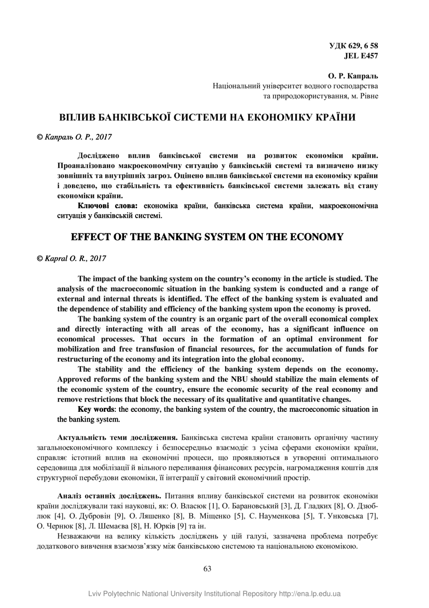 Капраль О. Р. Вплив банківської системи на економіку країни / О. Р. Капраль // Вісник Національного університету «Львівська політехніка». Серія: Логістика. — Львів : Видавництво Львівської політехніки, 2017. — № 863. — С. 63–67.