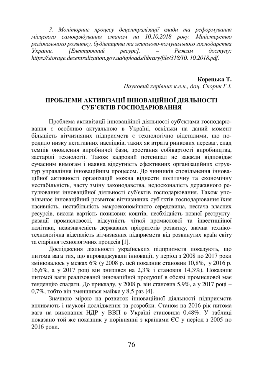 Корецька Т. Проблеми активізації інноваційної діяльності суб’єктів господарювання / Т. Корецька, Г. І. Скорик // 76-та Студентська науково-технічна конференція. Секція "Публічне управління та адміністрування" : збірник тез доповідей, 7 листопада 2018 року, Львів. — Львів : Видавництво Львівської політехніки, 2018. — С. 76–77.
