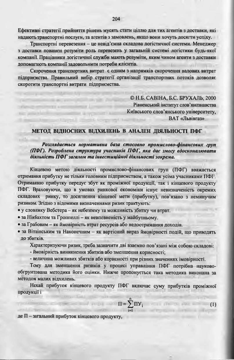 Савіна Н. Б. Метод відносних відхилень в аналізі діяльності ПФГ / Н. Б. Савіна, Б. С. Брухаль // Вісник Державного університету “Львівська політехніка”. — Львів : Видавництво Державного університету “Львівська політехніка”, 2000. — № 390 : Логістика. — С. 204–209.