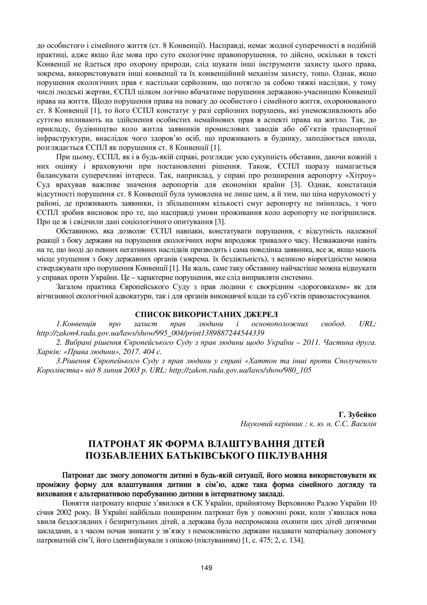 Зубейко Г. Патронат як форма влаштування дітей позбавлених батьківського піклування / Г. Зубейко, С. С. Василів // 76-та Студентська науково-технічна конференція. Секція права та психології : збірник тез доповідей, 15–29 жовтня 2018 року, Львів. — Львів : Видавництво Львівської політехніки, 2018. — С. 149–150. — (Цивільногого права та процесу).