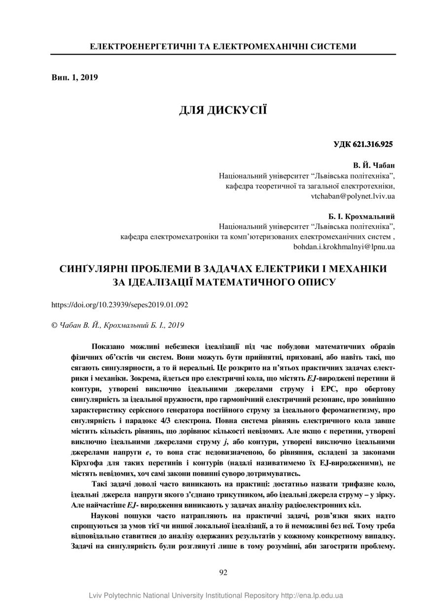 Чабан В. Й. Синґулярні проблеми в задачах електрики і механіки за ідеалізації математичного опису / В. Й. Чабан, Б. І. Крохмальний // Електроенергетичні та електромеханічні системи. — Львів : Видавництво Львівської політехніки, 2019. — Том 1. — № 1. — С. 92–98.