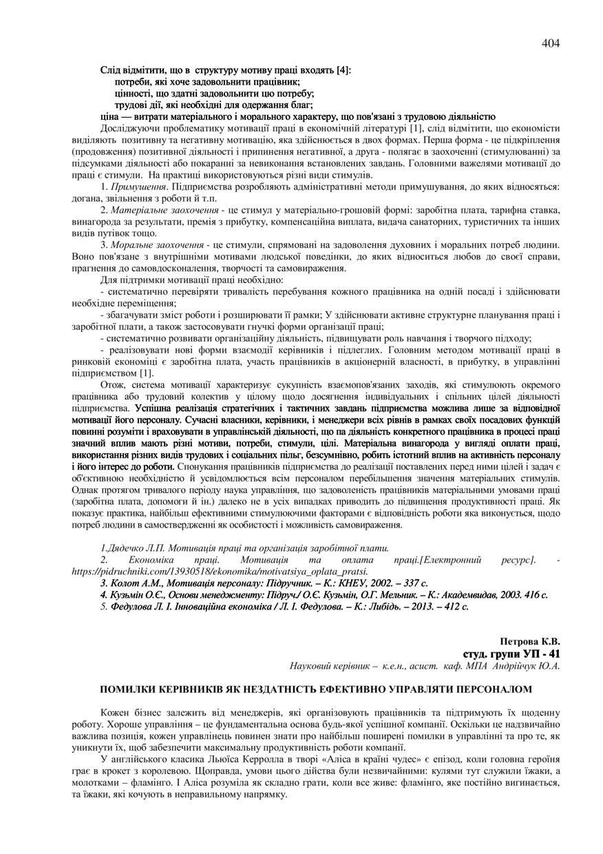 Петрова К. В. Помилки керівників як нездатність ефективно управляти персоналом / К. В. Петрова, Ю. А. Андрійчук // 76-та Студентська науково-технічна конференція. Секція "Економіка і менеджмент" : збірник тез доповідей, жовтень – листопад 2018 року. — Львів : Видавництво Львівської політехніки, 2018. — С. 404–405. — (Актуальні проблеми і напрями розвитку менеджменту персоналу та економіки праці в сучасних реаліях).