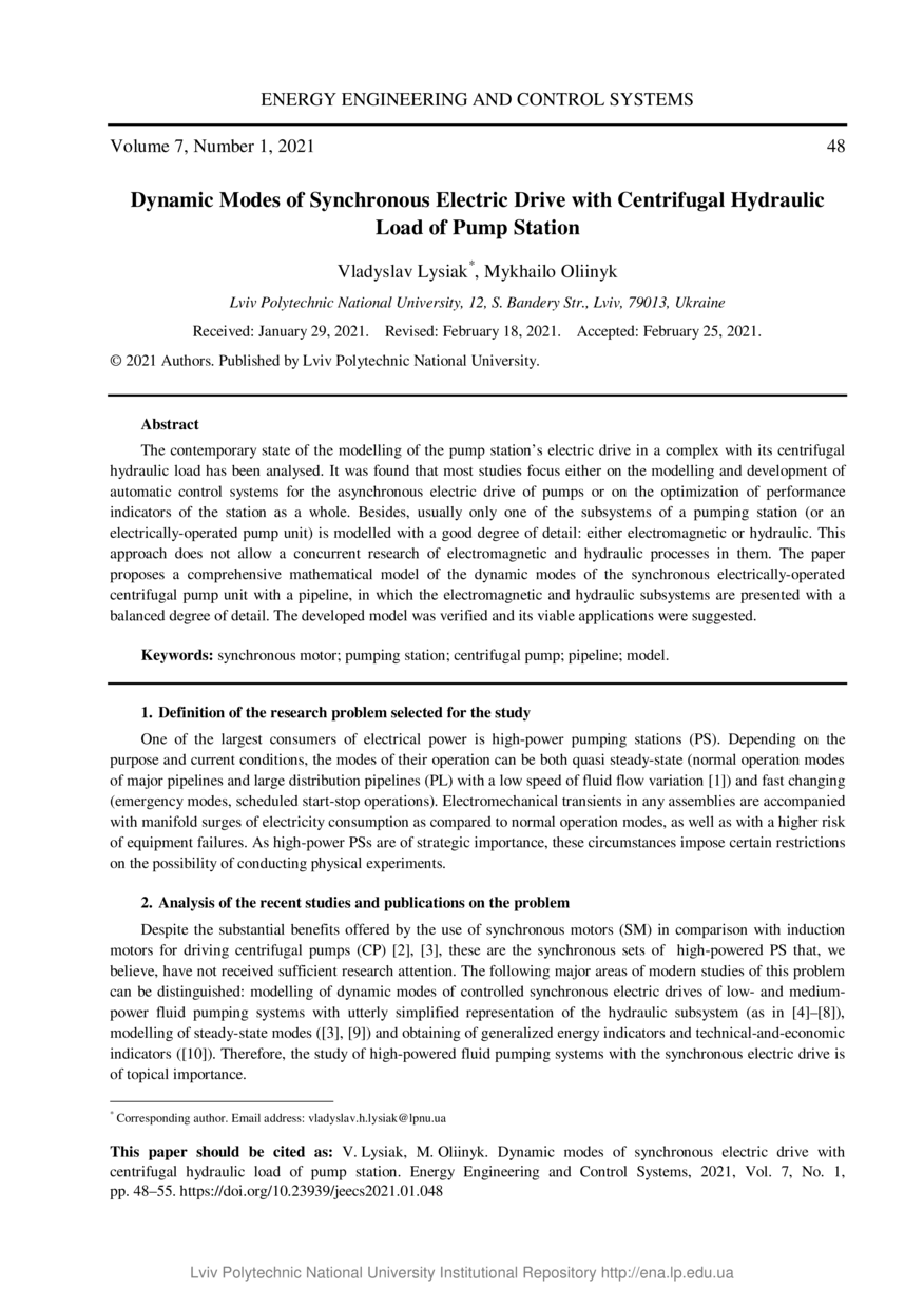 Lysiak V. Dynamic modes of synchronous electric drive with centrifugal hydraulic load of pump station / Vladyslav Lysiak, Mykhailo Oliinyk // Energy Engineering and Control Systems. — Lviv : Lviv Politechnic Publishing House, 2021. — Vol 7. — No 1. — P. 48–55.