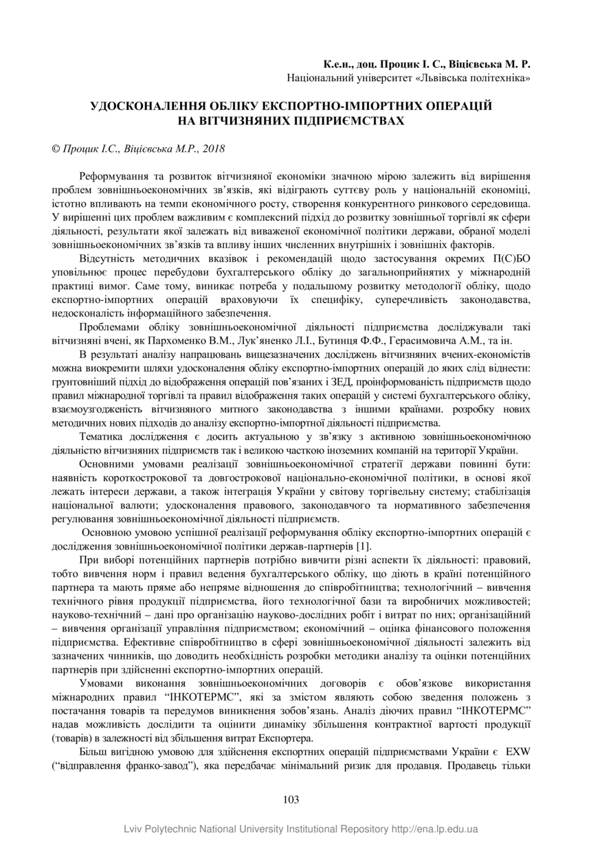 | dc.identifier.citationen | Protsyk I. S. Udoskonalennia obliku eksportno-importnykh operatsii na vitchyznianykh pidpryiemstvakh / I. S. Protsyk, M. R. Vitsiievska // Problemy ekonomiky, finansiv ta upravlinnia eksportno-importnoiu diialnistiu : materialy III Mizhnarodnoi naukovo-praktychnoi internet-konferentsii, 16 travnia 2018 roku Lviv. — Lviv : Vydavnytstvo Lvivskoi politekhniky, 2018. — P. 103–104. — (Oblik ta finansuvannia eksportno-importnoi tamytnoi diialnosti). | |