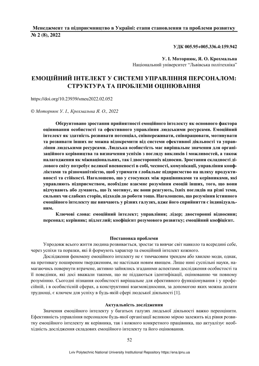 Моторнюк У. І. Емоційний інтелект у системі управління персоналом: структура та проблеми оцінювання / У. І. Моторнюк, Я. О. Крохмальна // Менеджмент та підприємництво в Україні: етапи становлення і проблеми розвитку. — Львів : Видавництво Львівської політехніки, 2022. — Том 4. — № 2. — С. 52–60.