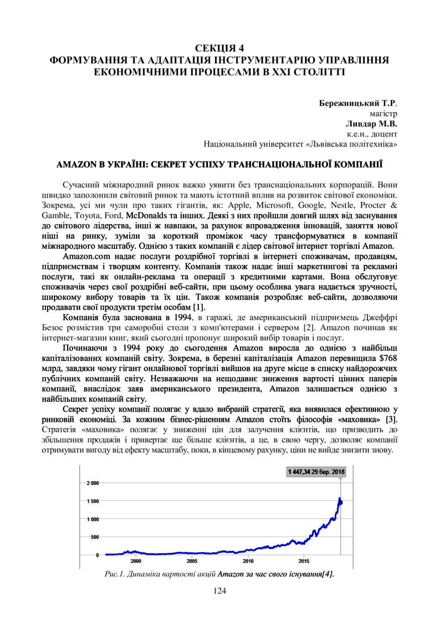 Бережницький Т. Р. Amazon в Україні: секрет успіху транснаціональної компанії / Т. Р. Бережницький, М. В. Ливдар // Управління економічними процесами на макро- і мікрорівні: проблеми та перспективи вирішення : матеріали ІІІ Міжнародної науково-практичної інтернет-конференції молодих учених, 24–25 квітня 2018 р., Львів. — Львів : Видавництво Львівської політехніки, 2018. — С. 124–125. — (Формування та адаптація інструментарію управління економічними процесами в ХХІ столітті).