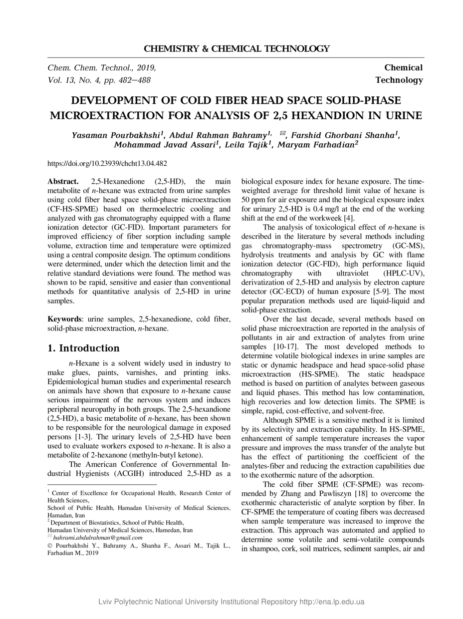 Development of Cold Fiber Head Space Solid-Phase Microextraction for Analysis of 2,5 Hexandion in Urine / Yasaman Pourbakhshi, Abdul Rahman Bahramy, Farshid Ghorbani Shanha, Mohammad Javad Assari, Leila Tajik, Maryam Farhadian // Chemistry & Chemical Technology. — Lviv : Lviv Politechnic Publishing House, 2019. — Vol 13. — No 4. — P. 482–488.