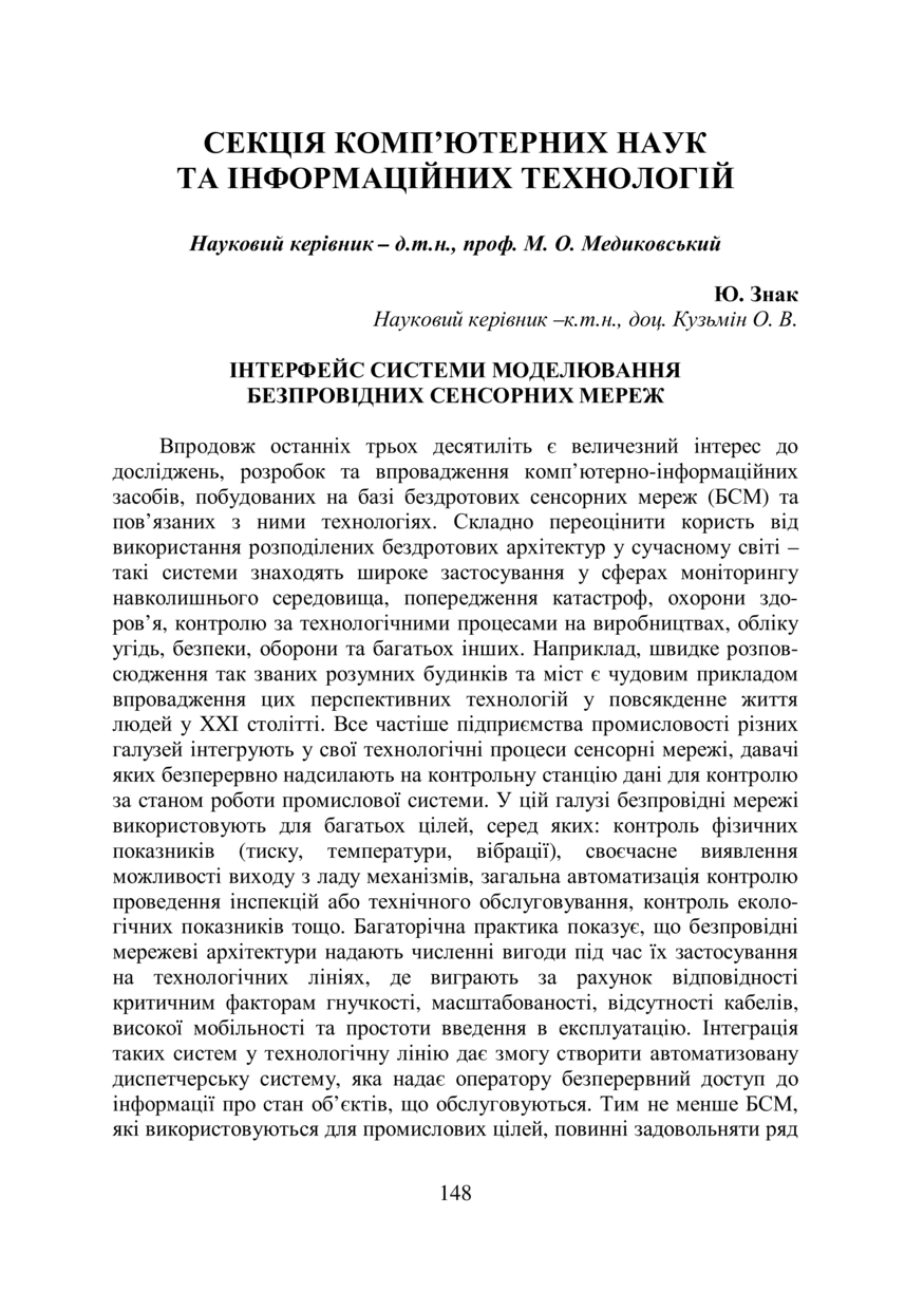 | dc.identifier.citationen | Znak Iu. Interfeis systemy modeliuvannia bezprovidnykh sensornykh merezh / Yu. Znak, O. V. Kuzmin // 76-ta Studentska naukovo-tekhnichna konferentsiia : zbirnyk tez dopovidei, zhovten 2018 roku, Lviv. — Vydavnytstvo Lvivskoi politekhniky, 2018. — P. 148–150. — (Sektsiia kompiuternykh nauk ta informatsiinykh tekhnolohii). | |