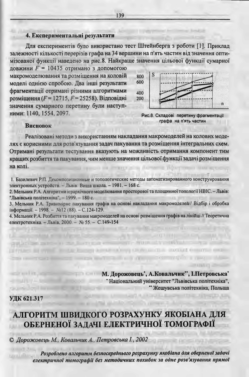 Дорожовець М. Алгоритм швидкого розрахунку Якобіана для оберненої задачі електричної томографії / М. Дорожовець, А. Ковальчик, І. Петровська // Вісник Національного університету “Львівська політехніка”. — Львів : Видавництво Національного університету “Львівська політехніка”, 2002. — № 468 : Комп’ютерна інженерія та інформаційні технології. — С. 139–145.