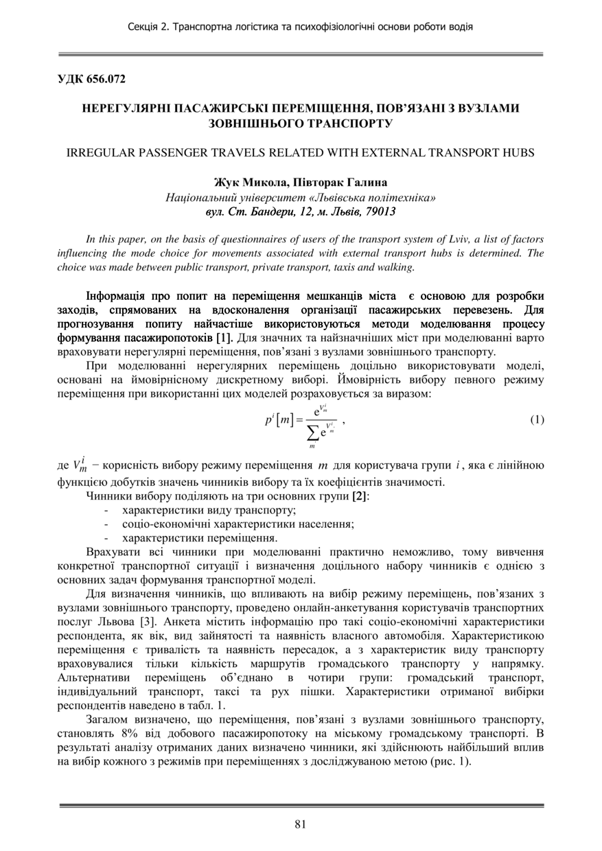 Жук М. Нерегулярні пасажирські переміщення, пов’язані з вузлами зовнішнього транспорту / Микола Жук, Галина Півторак // Проблеми з транспортними потоками і напрями їх розв’язання : тези доповідей ІV Всеукраїнської науково-теоретичної конференції, 25–26 березня 2021 року, Львів. — Львів : ТзОВ «Галицька видавнича спілка», 2021. — С. 81–82. — (Транспортна логістика та психофізіологічні основи роботи водія).