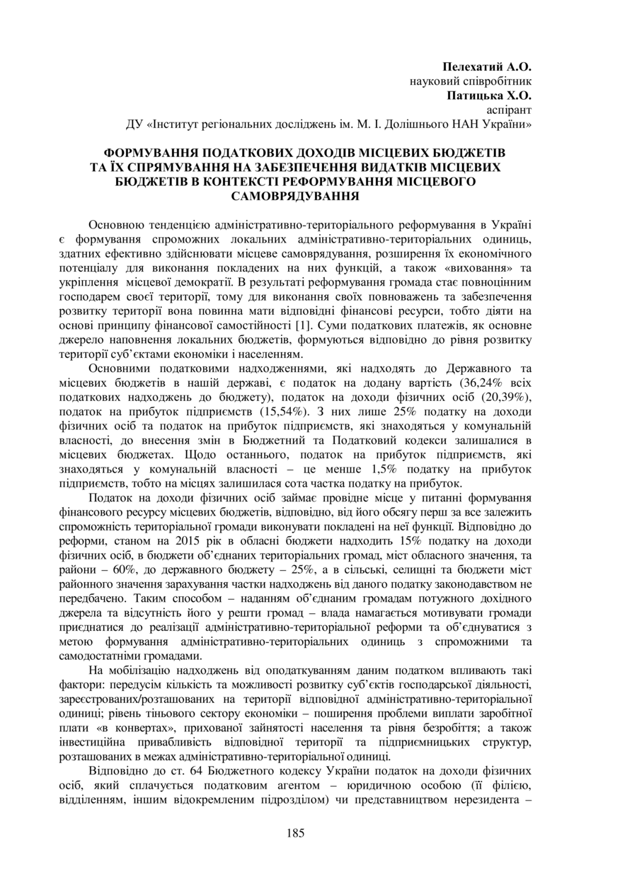 Пелехатий А. О. Формування податкових доходів місцевих бюджетів та їх спрямування на забезпечення видатків місцевих бюджетів в контексті реформування місцевого самоврядування / А. О. Пелехатий, Х. О. Патицька // Управління економічними процесами на макро- і мікрорівні: проблеми та перспективи вирішення : матеріали ІІ Міжнародної науково-практичної інтернет-конференції молодих вчених, 14–15 квітня 2016 року, Львів. — Львів : Видавництво Львівської політехніки, 2016. — С. 185–188. — (Формування та адаптація інструментарію управління економічними процесами в ХХІ столітті).