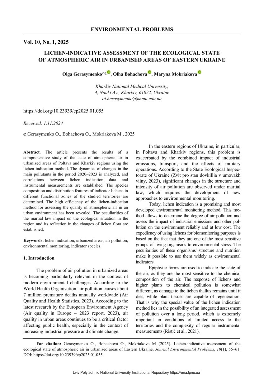 Gerasymenko O. Lichen-indicative assessment of the ecological state of atmospheric air in urbanised areas of Eastern Ukraine / Olga Gerasymenko, Olha Bohachova, Maryna Mokriakova // Environmental Problems. — Lviv : Lviv Politechnic Publishing House, 2025. — Vol 10. — No 1. — P. 55–61.