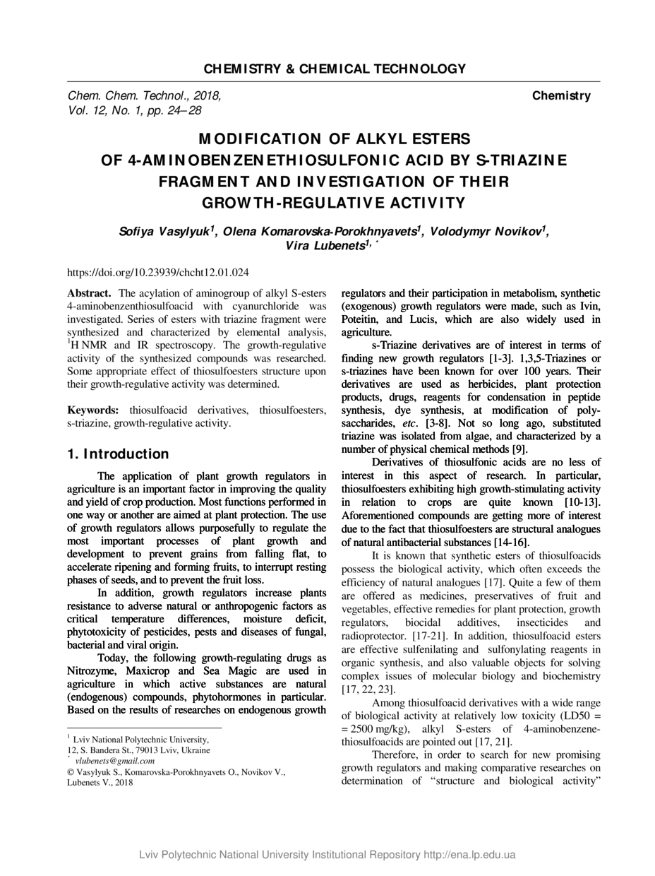 Modification of alkyl esters of 4-aminobenzenethiosulfonic acid by S-triazine fragment and investigation of their growth-regulative activity / Sofiya Vasylyuk, Olena Komarovska-Porokhnyavets, Volodymyr Novikov, Vira Lubenets // Chemistry & Chemical Technology. — Lviv : Lviv Politechnic Publishing House, 2-18. — Vol 12. — No 1. — P. 24–28.
