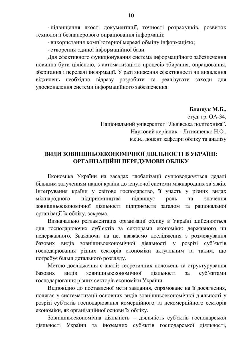 Блащук М. Б. Види зовнішньоекономічної діяльності в Україні: організаційні передумови обліку / М. Б. Блащук, Н. О. Литвиненко // Бухгалтерський облік, аналіз і аудит в системі інформаційного забезпечення підприємств : тези доповідей IV Всеукраїнської науково-практичної інтернет-конференції молодих вчених, 23 березня 2018 року, Львів. — Львів : Видавництво Львівської політехніки, 2018. — С. 10–12. — (Розвиток систем інформаційного забезпечення управління підприємством).