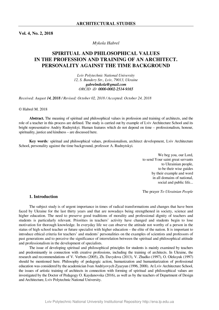 Habrel M. Spiritual and philosophical values in the profession and training of an architect. Personality against the time background / Mykola Habrel // Architectural Studies. — Lviv : Lviv Politechnic Publishing House, 2018. — Vol 4. — No 2. — P. 179–188.
