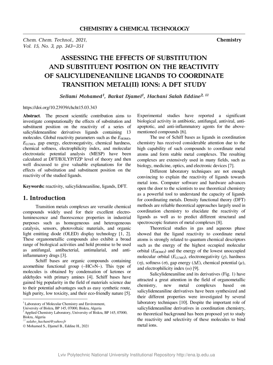 Mohamed S. Assessing the Effects of Substitution and Substituent Position on the Reactivity of Salicylideneaniline Ligands to Coordinate Transition Metal(II) Ions: a DFT Study / Sellami Mohamed, Barkat Djamel, Hachani Salah Eddine // Chemistry & Chemical Technology. — Lviv : Lviv Politechnic Publishing House, 2021. — Vol 15. — No 3. — P. 343–351.
