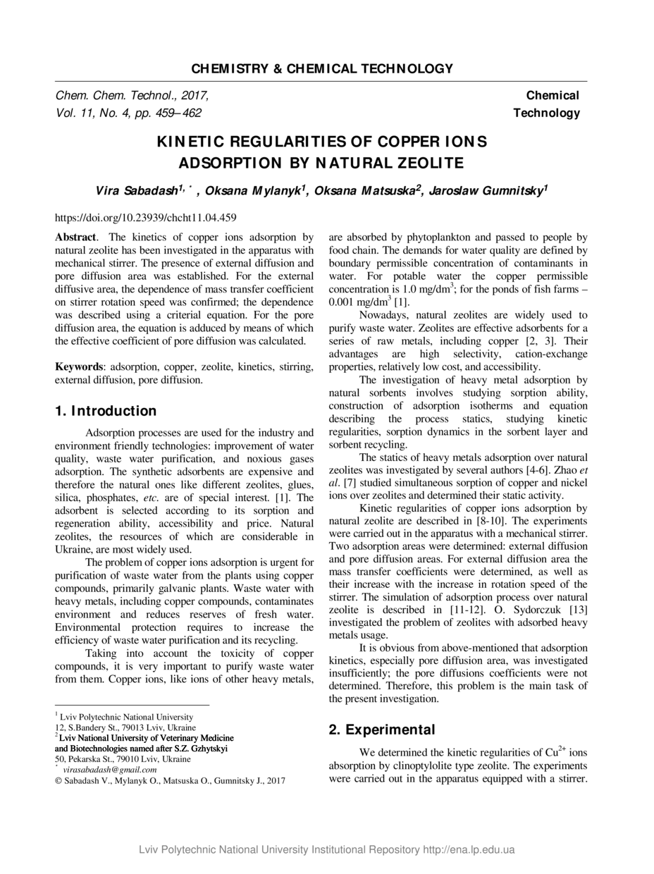 Kinetic regularities of copper ions adsorption by natural zeolite / Vira Sabadash, Oksana Mylanyk, Oksana Matsuska, Jaroslaw Gumnitsky // Chemistry & Chemical Technology. — Lviv : Lviv Politechnic Publishing House, 2017. — Vol 11. — No 4. — P. 459–462.