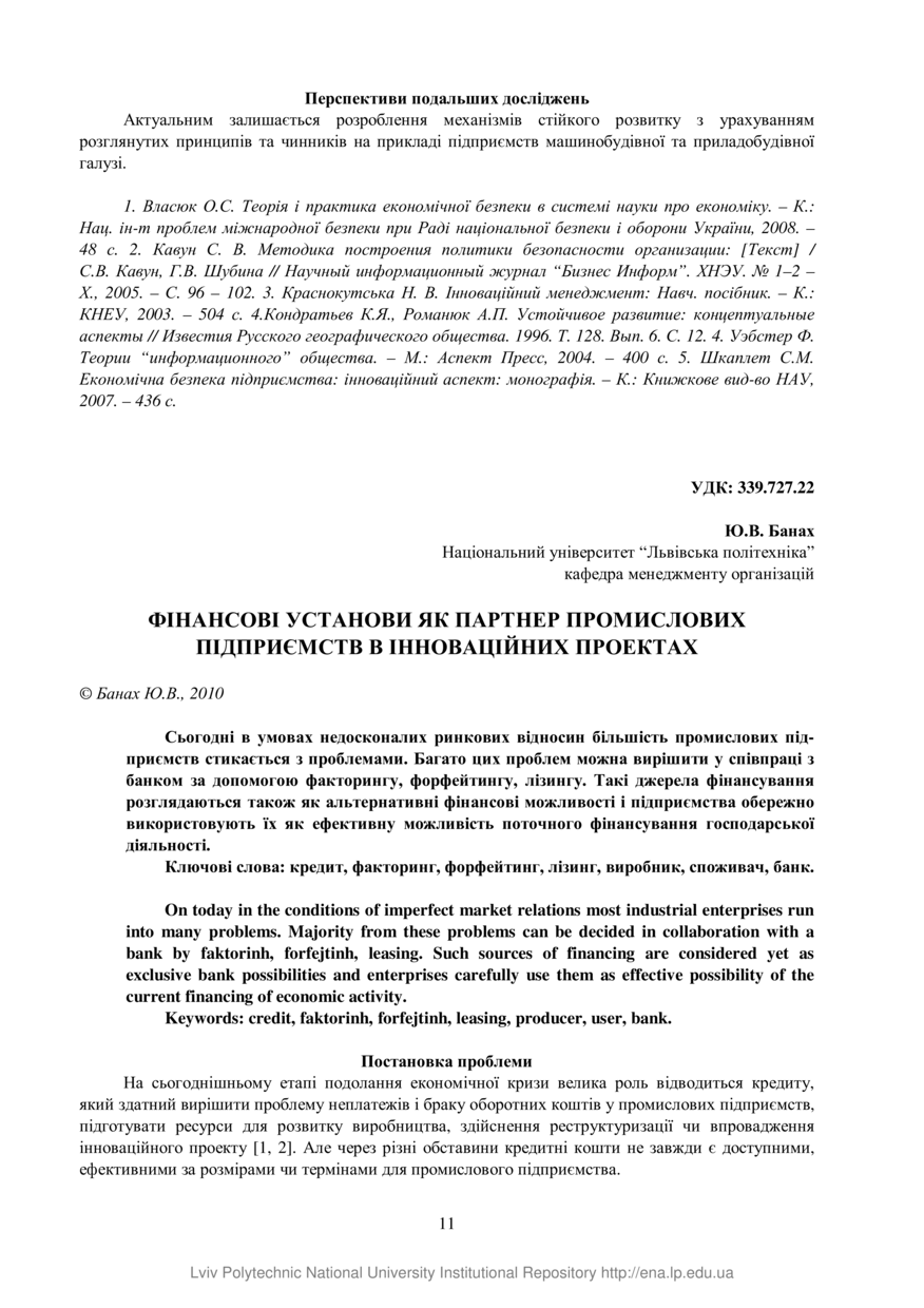 Банах Ю. В. Фінансові установи як партнер промислових підприємств в інноваційних проектах / Ю. В. Банах // Вісник Національного університету “Львівська політехніка”. — Львів : Видавництво Львівської політехніки, 2010. — № 668 : Проблеми економіки та управління. — С. 11–16.