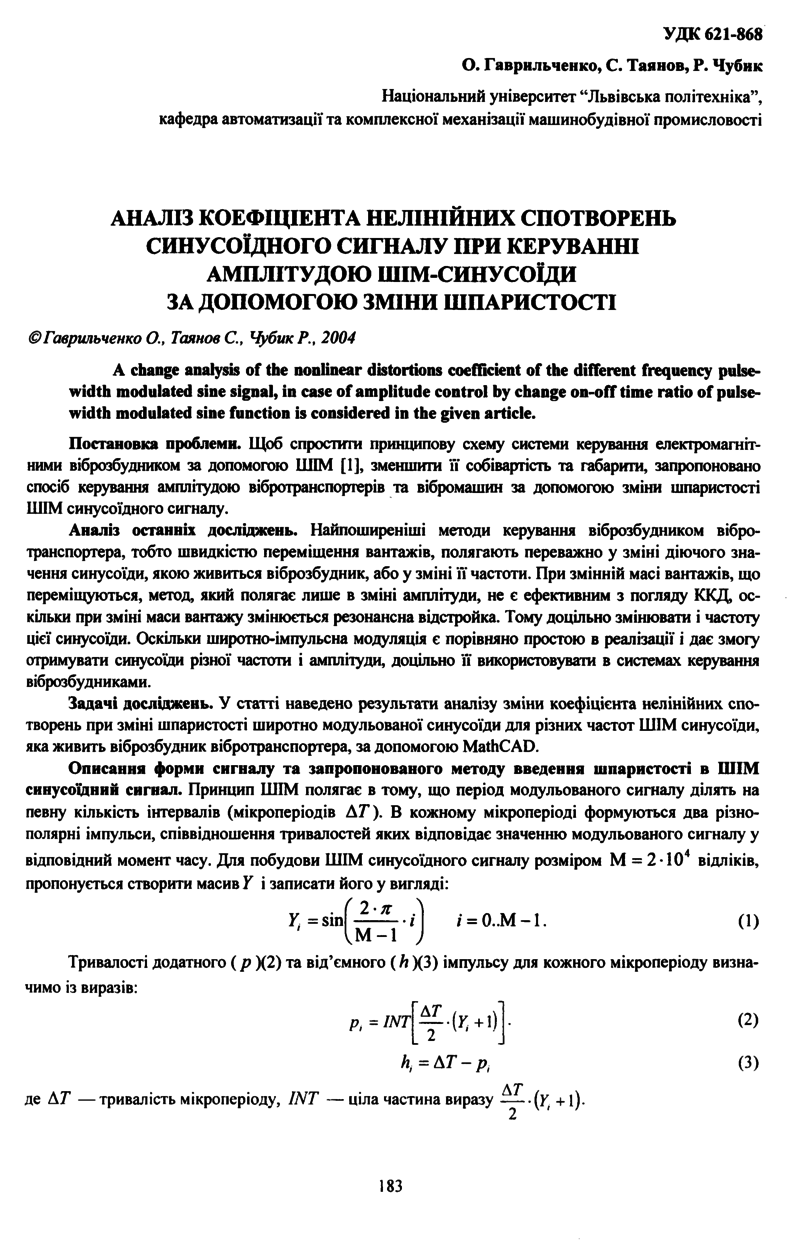 Гаврильченко О. Аналіз коефіцієнта нелінійних спотворень синусоїдного сигналу при керуванні амплітудою ШІМ-синусоїди за допомогою зміни шпаристості / О. Гаврильченко, С. Таянов, Р. Чубик // Вісник Національного університету “Львівська політехніка”. — Львів : Видавництво Національного університету “Львівська політехніка”, 2004. — № 506 : Теплоенергетика. Інженерія довкілля. Автоматизація. — С. 183–186.