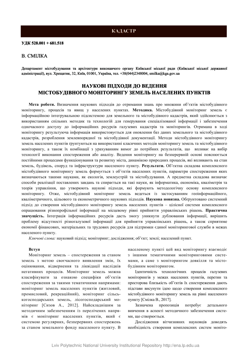 Смілка В. Наукові підходи до ведення містобудівного моніторингу земель населених пунктів / В. Смілка // Сучасні досягнення геодезичної науки та виробництва. — Львів : Видавництво Львівської політехніки, 2019. — № 2(38). — С. 97–103.