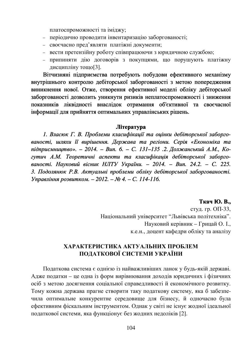 Ткач Ю. В. Характеристика актуальних проблем податкової системи України / Ю. В. Ткач, О. І. Грицай // Облік, аналіз і контроль в системі управління суб’єктами економіки : тези доповідей ІV Міжнародної студентської наукової конференції, 18–19 жовтня 2018 року, Львів. — Львів : Видавництво Львівської політехніки, 2018. — С. 104–106. — (Актуальні проблеми бухгалтерського, управлінського та податкового обліку і шляхи їх вирішення).