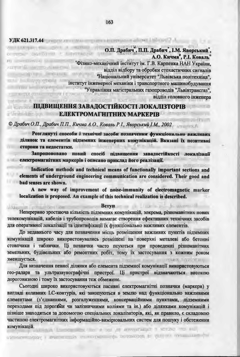 Підвищення завадостійкості локалізторів електромагнітних маркерів / О. П. Драбич, П. П. Драбич, І. М. Яворський, А. О. Кичма, Р. І. Коваль // Вісник Національного університету “Львівська політехніка”. — Львів : Видавництво Національного університету “Львівська політехніка”, 2002. — № 440 : Радіоелектроніка та телекомунікації. — С. 163–170.