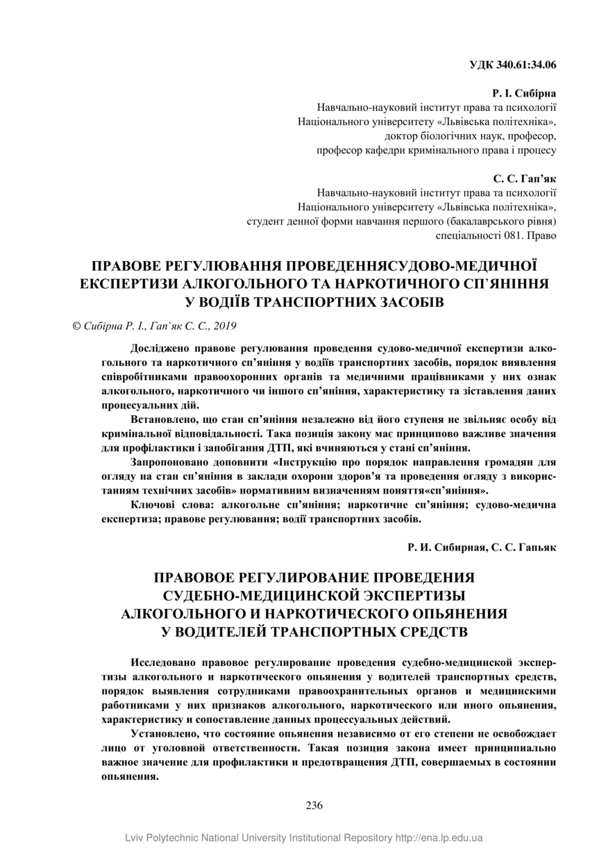Сибірна Р. І. Правове регулювання проведення судово-медичної експертизи алкогольного та наркотичного сп’яніння у водіїв транспортних засобів / Р. І. Сибірна, С. С. Гап’як // Вісник Національного університету “Львівська політехніка”. Серія: Юридичні науки. — Львів : Видавництво Львівської політехніки, 2019. — № Випуск 21. — С. 236–243.