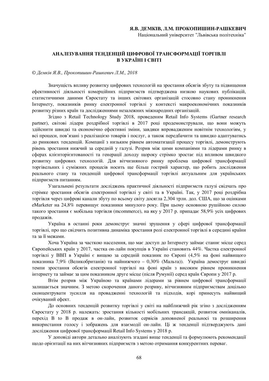 Демків Я. В. Аналізування тенденцій цифрової трансформації торгівлі в Україні і світі / Я. В. Демків, Л. М. Прокопишин-Рашкевич // Маркетинг та логістика в системі менеджменту : тези доповідей XІI Міжнародної науково-практичної конференції, 25–27 жовтня 2018 року, Львів. — Львів : Видавництво Львівської політехніки, 2018. — С. 68.