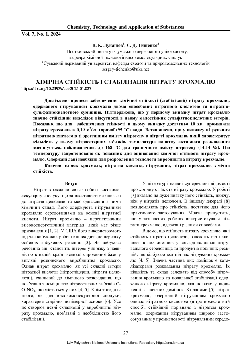 Лукашов В. К. Хімічна стійкість і стабілізація нітрату крохмалю / В. К. Лукашов, С. Д. Тищенко // Хімія, технологія речовин та їх застосування. — Львів : Видавництво Львівської політехніки, 2024. — Том 1. — № 7. — С. 27–34.