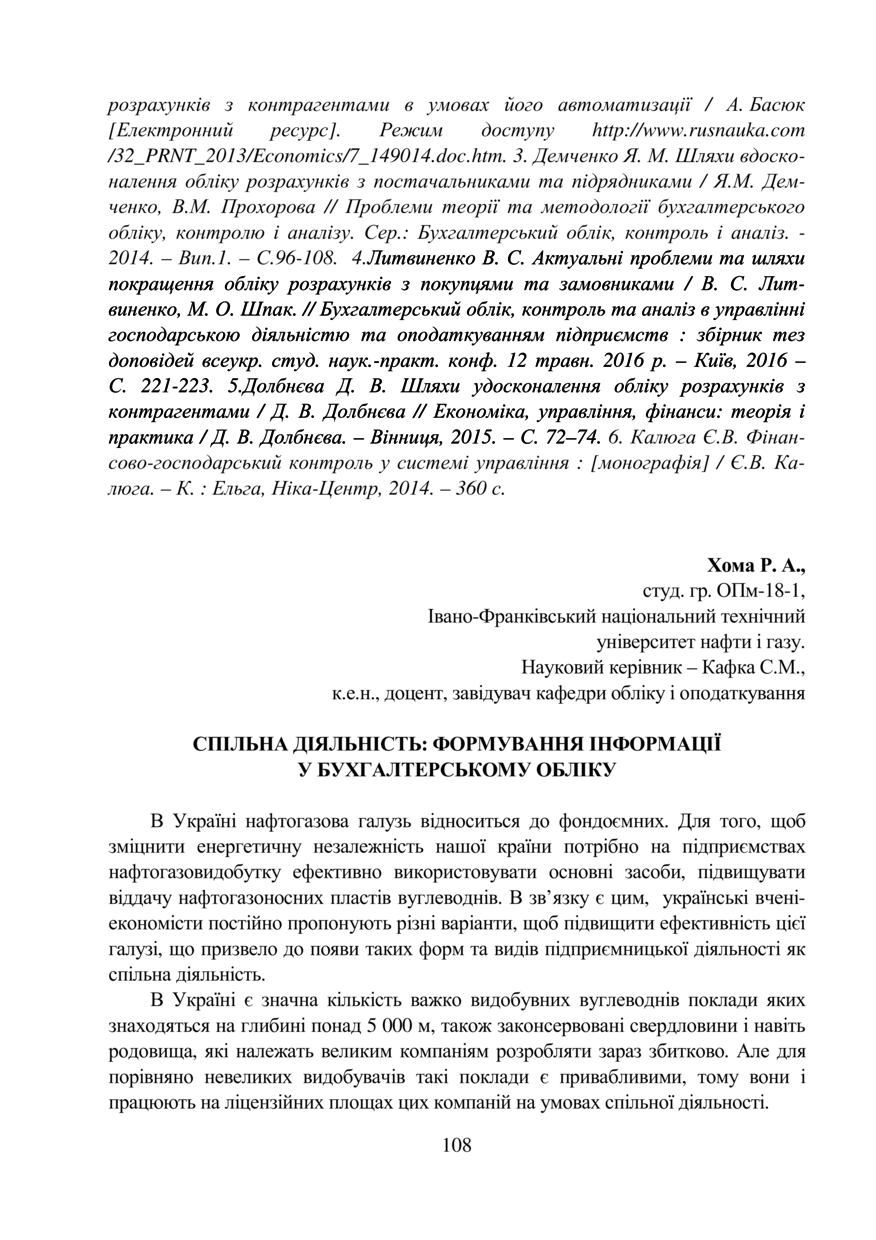 Хома Р. А. Спільна діяльність: формування інформації у бухгалтерському обліку / Р. А. Хома, С. М. Кафка // Облік, аналіз і контроль в системі управління суб’єктами економіки : тези доповідей ІV Міжнародної студентської наукової конференції, 18–19 жовтня 2018 року, Львів. — Львів : Видавництво Львівської політехніки, 2018. — С. 108–111. — (Актуальні проблеми бухгалтерського, управлінського та податкового обліку і шляхи їх вирішення).