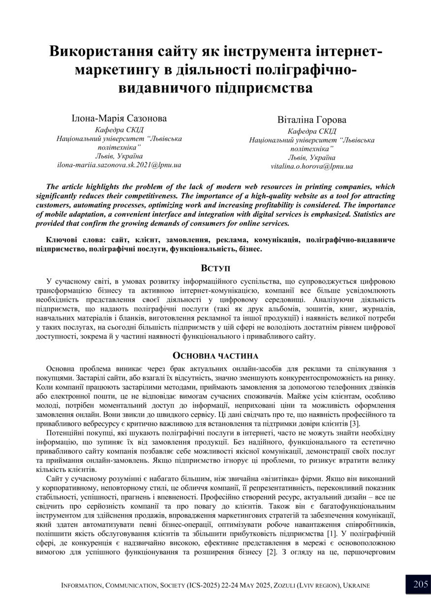 Сазонова І. Використання сайту як інструмента інтернет-маркетингу в діяльності поліграфічно-видавничого підприємства / Ілона-Марія Сазонова, Віталіна Горова // Інформація, комунікація, суспільство 2025: ICS-2025 : матеріали XIV Міжнародної наукової конференції, 22-24 травня 2025 року, Львів. — Львів : Видавництво Львівської політехніки, 2025. — С. 205–206. — (Соціальні комунікації).