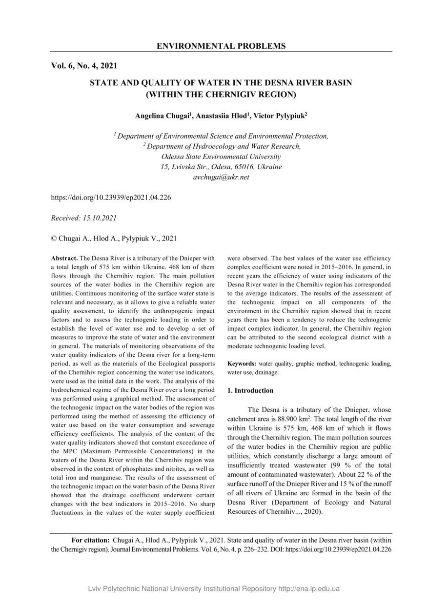 Chugai A. State and quality of water in the Desna river basin (Within the Chernigiv region) / Angelina Chugai, Anastasiia Hlod, Victor Pylypiuk // Environmental Problems. — Lviv : Lviv Politechnic Publishing House, 2021. — Vol 6. — No 4. — P. 226–232.