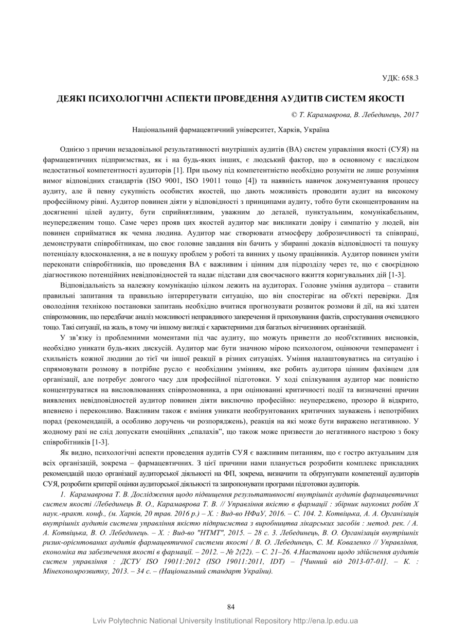| dc.relation.references | 1. Карамаврова Т. В. Дослідження щодо підвищення результативності внутрішніх аудитів фармацевтичних систем якості /Лебединець В. О., Карамаврова Т. В. // Управління якістю в фармації : збірник наукових робіт Х наук.-практ. конф., (м. Харків, 20 трав. 2016 р.) – Х. : Вид-во НФаУ, 2016. – С. 104. | |