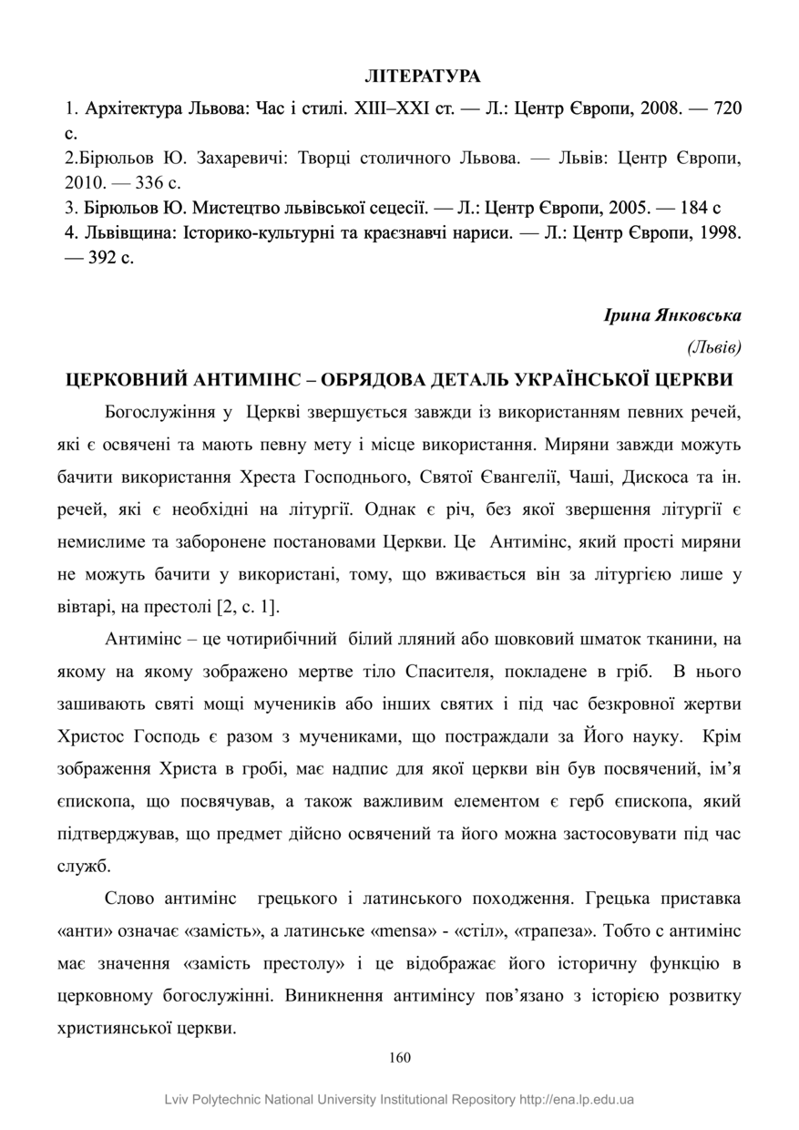 Янковська І. Церковний антимінс – обрядова деталь української Церкви / Ірина Янковська // Історико-культурна спадщина: європейський вимір : тези Всеукраїнської науково-практичної конференції, 1 червня, 2018 року, Львів. — Львів : Інтерпрінт, 2018. — С. 160–164.
