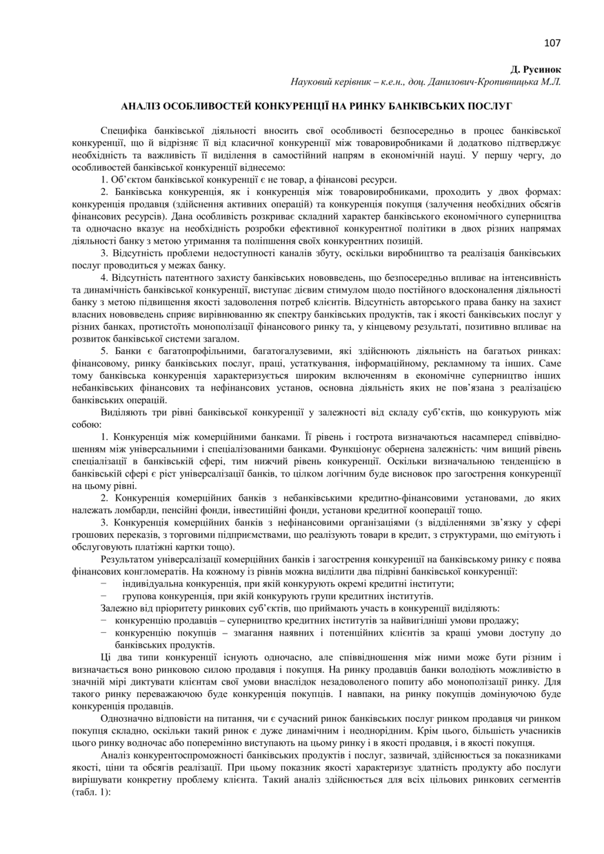 Русинок Д. Аналіз особливостей конкуренції на ринку банківських послуг / Д. Русинок, М. Л. Данилович-Кропивницька // 77-ма Студентська науково-технічна конференція. Секція "Публічне управління та адміністрування" : збірник тез доповідей, 7 листопада 2019 року, Львів. — Львів : Видавництво Львівської політехніки, 2019. — С. 107–108. — (Проблеми конкурентного регулювання).