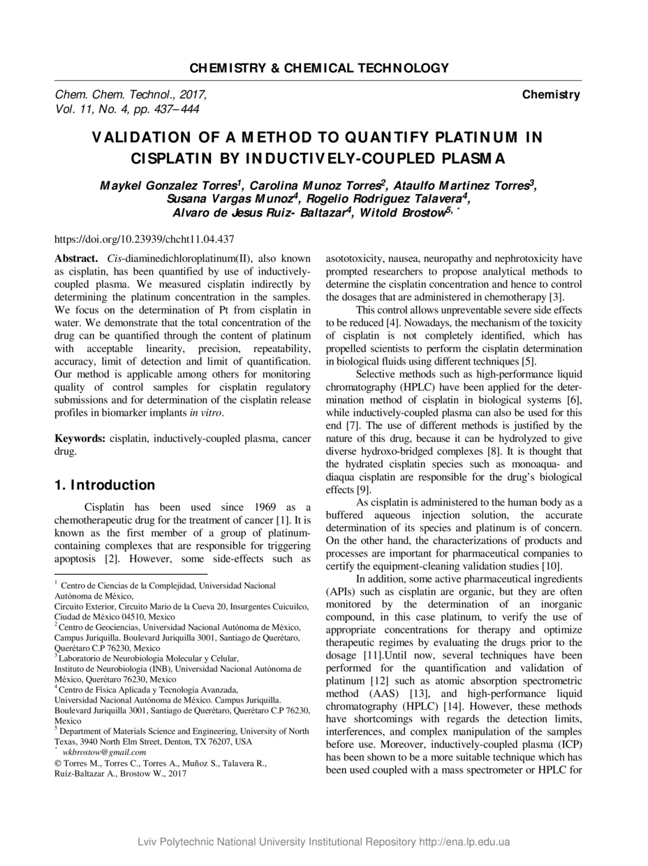 Validation of a method to quantify platinum in cisplatin by inductively-coupled plasma / Maykel Gonzalez Torres, Carolina Munoz Torres, Ataulfo Martinez Torres, Susana Vargas Munoz, Rogelio Rodriguez Talavera, Alvaro de Jesus Ruiz-Baltazar, Witold Brostow // Chemistry & Chemical Technology. — Lviv : Lviv Politechnic Publishing House, 2017. — Vol 11. — No 4. — P. 437–444.