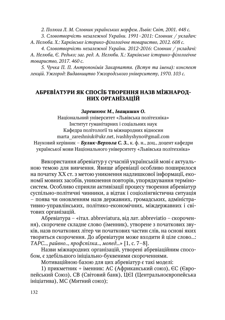 | dc.identifier.citationen | Zareshniuk M. Abreviatury yak sposib tvorennia nazv mizhnarodnykh orhanizatsii / M. Zareshniuk, O. Ivashchyshyn, S. Z. Bulyk-Verkhola // Ukrainska mova v prostori y chasi : materialy Vseukrainskoi studentskoi naukovo-praktychnoi konferentsii, 17–19 kvitnia 2019 roku, Lviv. — Lviv : Vydavnytstvo Lvivskoi politekhniky, 2019. — P. 132–133. — (Hramatychni osoblyvosti suchasnoi ukrainskoi movy). | |