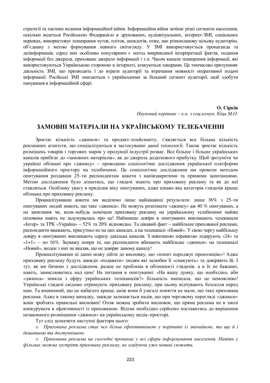 Сірків О. Замовні матеріали на українському телебаченні / О. Сірків, М. О. Кіца // 76-та Студентська науково-технічна конференція. Секція права та психології : збірник тез доповідей, 15–29 жовтня 2018 року, Львів. — Львів : Видавництво Львівської політехніки, 2018. — С. 223–224. — (Журналістики та засобів масової комунікації).