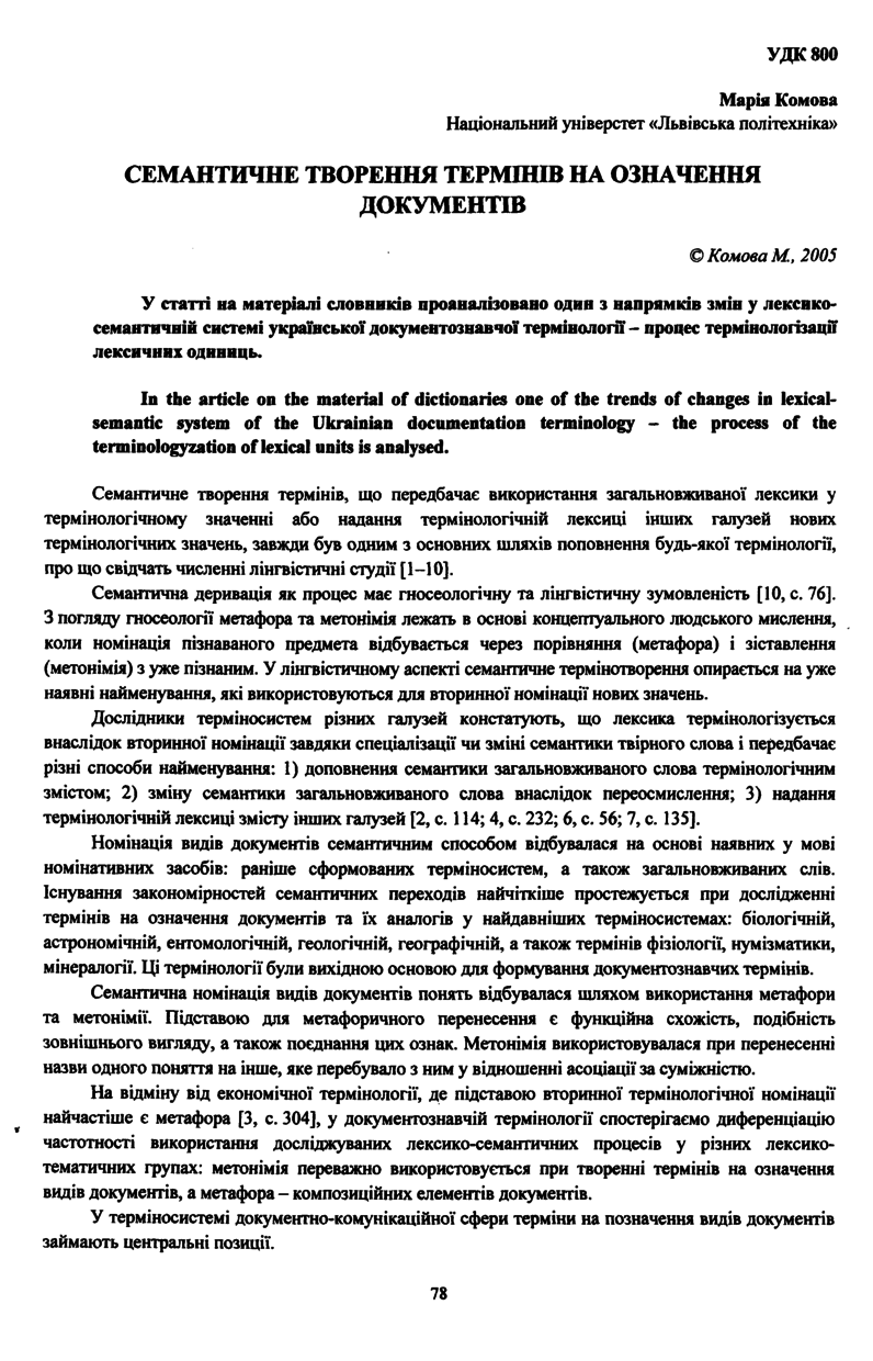 Комова М. Семантичне творення термінів на означення документі / Марія Комова // Вісник Національного університету “Львівська політехніка”. — Львів : Видавництво Національного університету “Львівська політехніка”, 2005. — № 538 : Проблеми української термінології. — С. 78–83. — (Термінологія гуманітарних знань).