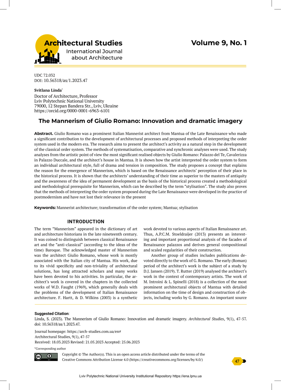 Linda S. The Mannerism of Giulio Romano: Innovation and dramatic imagery / Svitlana Linda // Architectural Studies. — Lviv : Lviv Politechnic Publishing House, 2023. — Vol 9. — No 1. — P. 47–57.