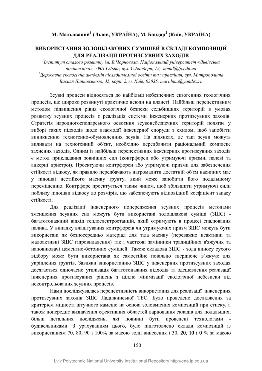 Мальований М. Використання золошлакових сумішей в складі композицій для реалізації протизсувних заходів / М. Мальований, М. Бондар // Сталий розвиток – стан та перспективи : матеріали міжнародного наукового симпозіуму SDEV‘2018, Львів-Славське, Україна, 28 лютого–3 березня 2018 року. — Львів : Панорама, 2018. — С. 150–151. — (Технології захисту довкілля для сталого розвитку).