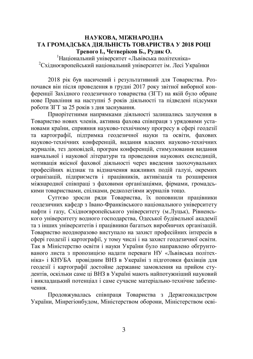 Тревого І. Наукова, міжнародна та громадська діяльність товариства у 2018 році / І. Тревого, Б. Четверіков, О. Рудик // GEOFORUM’2019 : тези доповідей 24 Міжнародної науково-технічної конференції, 10–12 квітня 2019 року, Львів. — Львів : Видавництво Львівської політехніки, 2019. — С. 3–5.