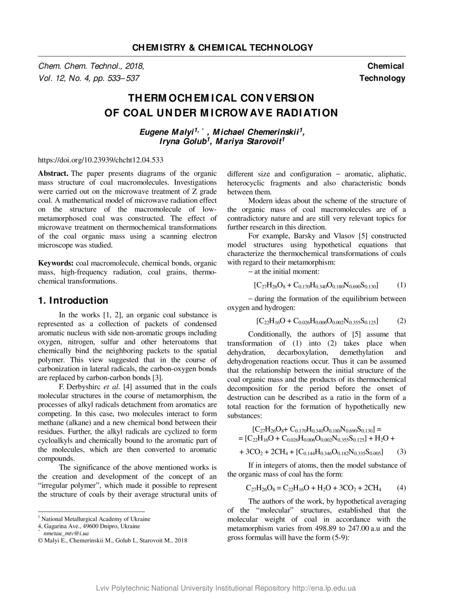 | dc.identifier.citation | Thermochemical conversion of coal under microwave radiation / Eugene Malyi, Michael Chemerinskii, Iryna Golub, Mariya Starovoit // Chemistry & Chemical Technology. — Lviv : Lviv Politechnic Publishing House, 2018. — Vol 12. — No 4. — P. 533–537. | |