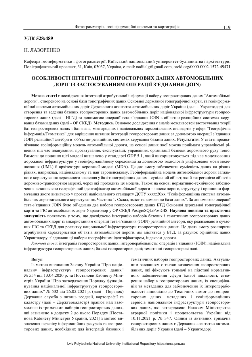 Лазоренко Н. Особливості інтеграції геопросторових даних автомобільних доріг із застосуванням операції з’єднання (JOIN) / Н. Лазоренко // Сучасні досягнення геодезичної науки та виробництва. — Львів : Видавництво Львівської політехніки, 2023. — Том 1. — № 45. — С. 119–131.